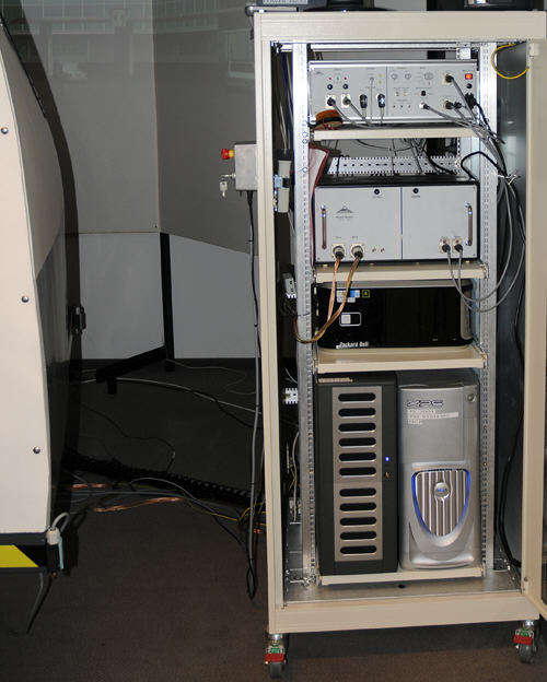 Meine Fuelberechnung ergab, dass wir mit 10 Tonnen Kerosin nach Korsika und wieder zurück kommen und auch die gesetzlich vorgeschriebenen Sicherheitsreserven einhalten würden. Die gesamte Flugdistanz betrug 326 Meilen. Die Route, insbesondere die SID’s (Standard Instrument Depature) und auch den Approach (Anflug) in Korsika kannten wir schon recht gut von unseren Flügen mit der B767. Also betraten wir gut vorbereitet und voller Motivation den Simulatorraum. Der Anblick des Cockpits ist genial und für sich alleine schon die Reise nach Winterthur wert. Das ganze Cockpit steht auf einer Motionplattform der Firma Simtechnik. Ein 135° Visualsystem mit drei Beamern sorgt für ein realistisches Fluggefühl.
