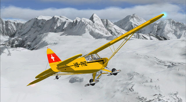 Mit "Gletscherpilot X" von Kurt Stoeckli kommt erstmals ein Produkt auf den Markt, mit dem das möglich ist und von www.design4fs.ch oder www.mailsoft.com zum Preis von CHF 39.- vertrieben wird. Dafür erhält man auf DVD oder per Download total 13 real benutzte Landplätze auf den Gletschern Kanderfirn, Petersgrat, Jungfraujoch, Clariden sowie Wildhorn. Dazu gibt es eine für das Add-On optimierte Piper Super Cub von Simon Smeiman. Deren 4 klassischen Schweizer Bemalungen wurden von Kurt Stöckli gemacht. Diese bestehen aus drei noch fliegenden zivilen Maschinen HB-PHZ, HB-OBY, HB-PBA und einer militärischen Ausführung V-654 der Schweizer Luftwaffe, wie diese in der Zeit von 1964 bis 1976 eingesetzt wurde. Mit sieben FSX-Missionen kann der virtuelle Gletscherpilot seine Flugkünste gefahrlos testen. Zum erfolgreichen Umsetzen des Add-Ons hat auch Hans Fuchs beigetragen, einer der bekanntesten Schweizer Gletscherpiloten. Besonderes Lob verdient auch das detaillierte Handbuch in D/E/F. Die FSX-Missionen beinhalten Trainings-Flüge sowie fünf Flüge zu verschiedenen Gletschern als Herausforderung sind in Deutsch, Englisch oder Französisch absolvierbar und verfügen über die jeweilige Sprachausgabe, was durchaus nicht üblich ist. Als Auszeichnung winken eigens gestaltete Medaillen.