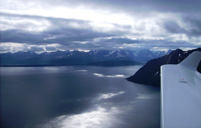 Der Weiterflug entlang der von zerklüfteten Fjorden durchzogenen Nordküste via Hammerfest wurde nach einem Tag Aufenthalt in Angriff genommen. Da diesmal die Zeit etwas drängte, wurde durchgehend mit 85% Leistung geflogen und so eine durchschnittliche Geschwindigkeit von 134 KTAS erreicht - angesichts der großen unverkleideten 21-Räder in ca. 4.000 ft immer noch ein sehr brauchbarer Wert. Dadurch konnte eine bürokratiebedingte Verspätung beim Abflug ohne Probleme wieder aufgeholt werden.